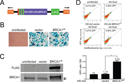 To efficiently express full-length BRCA1 in HCC1937 cells, which are a model cell system for elucidating BRCA1 function and are homozygous for the BRCA1 5382insC mutation [30], we generated helper-dependent adenoviral (HD-Ad) vectors co-expressing BRCA1 and a LacZ reporter [31] (Figure 1A). The benefits of expressing BRCA1 from adenovirus are several-fold in that gene copy number and expression levels can be fully controlled without imposing possible cell selection and expression artifacts resulting from stable and transient expression from plasmids. To test the infectivity of HCC1937 cells, we performed β-galactosidase (LacZ) staining and found high levels of infection efficiency (Figure 1B). We also confirmed expression of full-length BRCA1 by western blot analysis and found that it migrated slightly above the endogenous, truncated BRCA1 protein (erroneous translation distal to codon 1755) produced by HCC1937 cells (Figure 1C). The level of endogenous, truncated BRCA1 to virus-expressed BRCA1 was similar (2.6-fold above endogenous), which is critical since too much BRCA1 expression could possibly offset desired reconstituted effects. These results show that HD-Ad vectors infect HCC1937 cells with high yield and express full-length BRCA1 transiently at close to physiological levels.