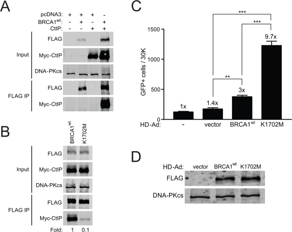 The K1702 residue resides within the binding pocket of the BRCA1 BRCT domain and interacts directly with the phospho-serine moiety of pS-X-X-F motif containing proteins that bind to the pocket [36]. Thus, we expected that the K1702M mutation would result in decreased binding of BRCT interacting proteins such as CtIP, which served as an indicator of the ability of this mutant to bind any phospho-protein in our study. Plasmids expressing wild-type or K1702M BRCA1 were co-transfected with a plasmid expressing CtIP into HEK293T cells followed by immuno-precipitation of FLAG-BRCA1. As expected, we found that wild-type BRCA1 bound CtIP efficiently (Figure 2A). We also noticed an increase in the abundance of BRCA1 and CtIP when co-expressed compared to either alone, suggesting that complex formation increases the stability of these two proteins. When we examined binding of CtIP to K1702M, we found at least a 10-fold reduction compared to wild-type BRCA1 (Figure 2B). These results demonstrate that the K1702M mutation disrupts the binding of CtIPin vivo, which is consistent with in vitro binding studies of peptides [36, 37]. Presumably, this disruption also extends to other phospho-proteins that normally bind the BRCA1 BRCT domain. Thus, the K1702M phenotype would be a reflection of the inability of any pS-X-X-F protein to bind BRCA1 and influence DSB repair.