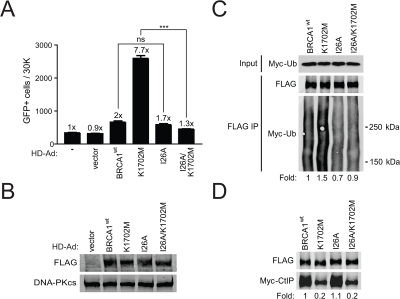 Plasmids pcDNA3(BssHII)-HA-3XFLAG-BRCA1 wt, K1702M, I26A, I26A/K1702M, and M1775R were digested with BssHII and the HA-3XFLAG-BRCA1 fragments ligated into the AscI site of the helper-dependent adenovirus (HD-Ad) plasmid pΔ28E4LacZ [31]. The pΔ28E4LacZ-HA-3XFLAG-BRCA1 plasmids were digested with PmeI to release the viral DNA from the plasmid backbone. The viral DNA was packaged into adenovirus and amplified by transfecting HEK293-116C cells using Superfect (Qiagen) as described [31].