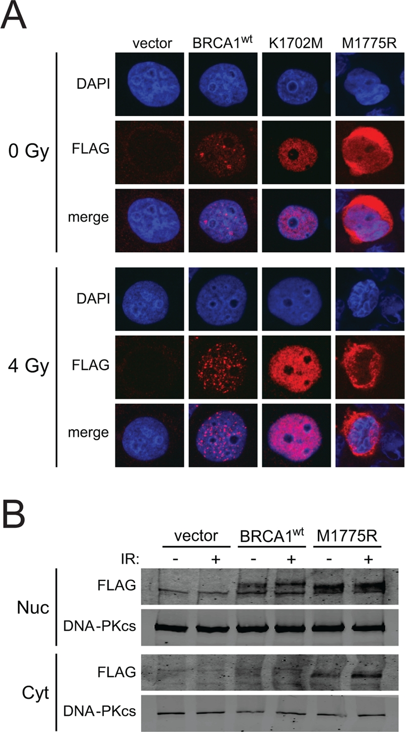 M1775R is a recurring deleterious BRCA1 mutation and one of the first reported missense mutations of BRCA1 [45-47]. The M1775R mutation prevents phospho-protein binding by sterically clashing with the phenylalanine ring of the pS-X-X-F motif as opposed to K1702M, which disrupts the electrostatic interaction of K1702 with the phospho-serine of the motif [36, 37, 48]. Previous studies have suggested that M1775R is impaired in nuclear localization and foci formation [36, 49, 50]. Therefore, we first examined whether BRCT mutants expressed from the HD-Ad vectors were able to enter the nucleus of HCC1937 cells. K1702M showed enhanced nuclear localization compared to wild-type BRCA1, regardless of irradiation (Figure 5A). In addition, M1775R also entered the nucleus but seemed to remain around the nuclear membrane. To substantiate this result, we conducted a cell fractionation experiment followed by western blotting and found that most of M1775R was indeed located in the nuclear fraction with some protein remaining in the cytoplasm, while there was little to no detectable wild-type BRCA1 in the cytoplasm regardless of whether cells were irradiated or not (Figure 5B). In the nuclear fraction, wild-type BRCA1 had slower electrophoretic mobility than M1775R, suggesting that the wild-type protein was more heavily modified than the mutant. These results suggest that while there may be some impairment to M1775R nuclear localization as previously reported [36, 49, 50], significant levels of BRCA1 BRCT mutant proteins were present in the nucleus following their expression from HD-Ad vectors, which would be necessary to influence HRR.