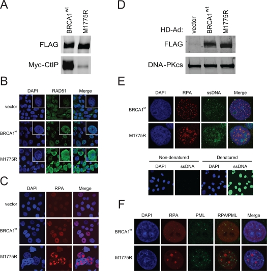 M1775R also demonstrated a much reduced ability to bind CtIP and produced elevated levels of RAD51 and RPA nuclear staining compared to wild-type BRCA1 when BRCA1 expression levels were similar, all of which were not dependent on exogenous DNA damage (Figure 6A-D). In fact, M1775R induced the formation of what appeared to be large, clustered RPA foci. To determine whether the increased nuclear RAD51 and RPA staining was indeed the result of increased ssDNA engaged in recombination, we examined the extent of ssDNA formation by an assay that utilizes BrdU incorporation into DNA [41]. Indeed, M1775R cells showed elevated levels of ssDNA that to some extent co-localized with the large clusters of RPA foci compared to the much smaller co-localized foci seen in wild-type BRCA1 cells (Figure 6E). Furthermore, in cells expressing wild-type BRCA1, RPA was juxtaposed with promyelocytic leukemia (PML) nuclear bodies (NBs) whereas cells expressing M1775R showed highly unusual, thread-like PML-NBs that did not co-localize with RPA (Figure 6F). PML-NBs are believed to be nuclear compartments for post-translational processing such as (de)SUMOylation and (de)ubiquitination and the (de)assembly of protein complexes critical for transcription and DNA repair [51, 52]. Recently, it was shown that SUMOylation is important for efficient HRR [28, 29]. Thus, the appearance of atypical, thread-like PML-NBs in M1775R but not wild-type BRCA1 expressing cells suggests that M1775R promotes the generation of these abnormal PML-NBs. All combined, the naturally occurring M1775R mutant generated a similar, if not more dramatic, phenotype compared to K1702M in terms of RAD51 and RPA nuclear staining, but also showed evidence of extensively resected DNA and unusual looking PML-NBs, perhaps indicative of stalled repair.
