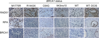 We next determined whether our in vitro results would translate into effects seen in human breast cancer tissue. Sections from patients with various BRCA1 mutations, including M1775R and C64G (reported to have a similar defect in ubiquitin-ligase activity as the synthetic I26A mutation [43]), and patients with normal BRCA1 breast tumors were examined. Consistent with our in vitro data, the M1775R tissue section showed increased RAD51 and RPA staining in nuclear malignant regions (Figure 7; Supplemental Table S1). In fact, the RPA levels in M1775R were the highest of all the sections and similar to those of a ductal carcinoma in situ (DCIS) section (WT-DCIS). However, the M1775R section did not show any detectable BRCA1 staining, similar to the R1443X and 943ins10 sections. This result suggests that M1775R is down-regulated, perhaps due to toxicity and/or instability in vivo as reported in vitro [53]. This finding implies that considering the relatively low expression, M1775R results in very high relative levels of RAD51 and RPA if these are dependent on BRCA1 compared to those seen with either the R1443X or 943ins10 sections that also had low BRCA1 expression. On the other hand C64G, which is known to increase the stability of BRCA1 by oligomerization [54], showed high levels of RAD51, RPA, and BRCA1. Thus, the level of BRCA1 expression should be taken into consideration when assessing the impact of BRCA1 on HRR in vivo. Based on the high expression of RAD51 and RPA relative to low M1775R expression, these results suggest that M1775R may promote excessive HRR in vivo as has been suggested to occur in some breast cancers with low BRCA1 levels [55]. However, more tissues with BRCT mutations need to be screened before such an assertion could be made significant. We also observed elevated levels of RAD51 and RPA staining in a DCIS tissue section with wild-type BRCA1 that showed increased BRCA1 expression relative to malignant tissue. DCIS is commonly associated with non-invasive, pre-malignant breast cancer. Thus, the data presented here could perhaps have clinical implications in that RAD51 and RPA might be useful diagnostic markers for pre-malignant (DCIS) breast cancers and, in particular, for screening breast cancers for mutations in the BRCA1 BRCT domain that result in hyper-recombination.