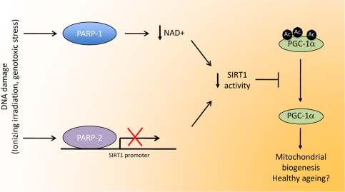 Recent observations from our lab [3, 4] can complement the observations from Sahin et al and introduce a matching mechanism by which DNA-damage can influence mitochondrial biogenesis. This new pathway involves the interplay between two enzymes, i.e. the Poly(ADP-ribose) polymerases (PARPs) and the sirtuins. Both enzyme families are strongly conserved in eukaryotes and share the particularity of using NAD+ as a cosubstrate, which is converted into nicotinamide (NAM) by the respective enzymatic activities [5]. PARP activity is mainly attributed to PARP-1, a ubiquitous and abundant nuclear protein. PARP-1 can bind to various DNA structures and nucleosomes, and has important roles in DNA repair, chromosome stability and transcriptional regulation (for review, see [6]). The reaction catalyzed by PARP-1 uses NAD+ to form polymers of ADP-ribose units onto acceptor proteins, cleaving off NAM. Cellular poly(ADP-ribose) (PAR) formation is dramatically stimulated upon DNA damage, and, as a result, NAD+ levels plummet when DNA is damaged [6, 7]. While PARP-1 accounts for 90% of PARP activity under genotoxic situations, a second enzyme, PARP-2 is responsible for the remaining 10% [8, 9]. The role and activation of other PARP family members under such circumstances remains unexplored.