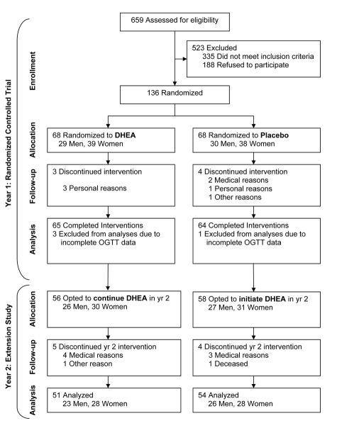 Of the 659 people who initially expressed interest in the study, 335 did not meet the inclusion criteria and 188 chose not to participate (Figure 1). The remaining 136 eligible volunteers were randomized to one year of DHEA replacement, 50 mg daily, or placebo. After completing the 12 mo randomized study, 112 of the participants volunteered to continue in an open-label study for an additional 12 mo. In the open-label study, the participants who had been randomized to DHEA replacement continued taking DHEA for a second year, while those who had been in the placebo group crossed over to DHEA replacement for 12-mo.