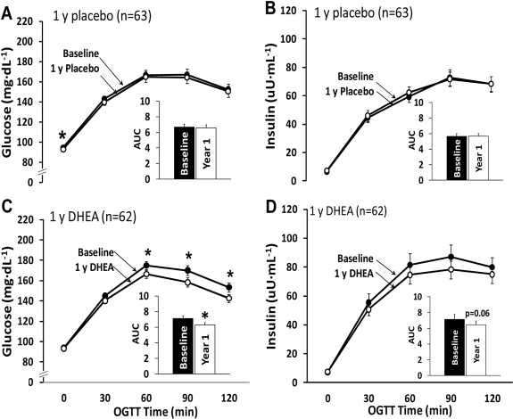 One year of DHEA replacement resulted in significant decreases in the glucose values at the 60 min, 90 min and 120 min time points of the oral glucose tolerance test (OGTT) and in the glucose area under the curve (AUC) (Figure 2C). A similar effect of DHEA replacement was seen in the participants in the placebo group who crossed over to DHEA in the second year open label study (data not shown). Insulin levels during the OGTT tended to be lower after one year of DHEA replacement, but the decrease did not attain statistical significance (p=0.06 for change in area under the insulin curve) (Figure 2D). However, the product of the glucose AUC and insulin AUC, an indicator of insulin resistance [11], was significantly improved, i.e. reduced, in response to one year of DHEA replacement (~22%, p,0.01), and was unchanged in the placebo group.