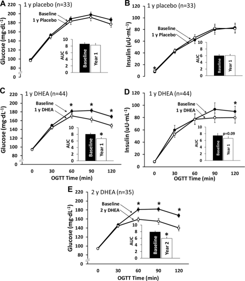 In conclusion, the results of this study confirm our previous finding that DHEA replacement in elderly men and women improves insulin action [10]. They further show that a longer period of DHEA treatment than was evaluated in our previous study, 12 mo vs. 6 mo, also significantly improves glucose tolerance, and that this improvement occurs only in those individuals who have abnormal glucose tolerance. These findings raise the possibility that DHEA could become a first line treatment for glucose intolerance/insulin resistance and diabetes prevention in older individuals and ameliorate the increase in chronic inflammation that occurs with aging.