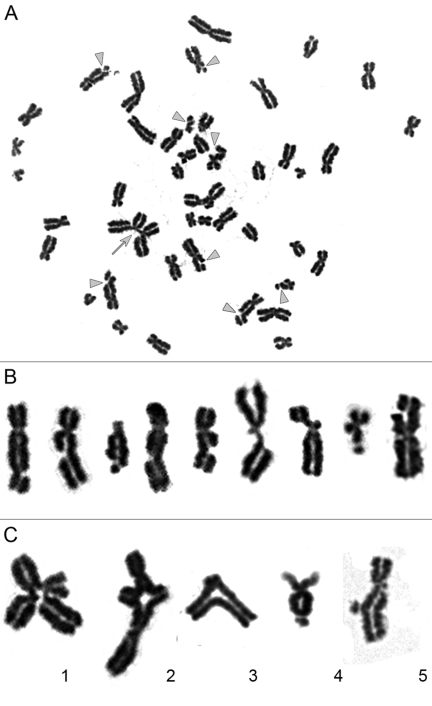 Non-irradiated cell lines are characterized by low levels of chromatid fragments, with average frequencies detected ranging from 0.01-0.08 per cell (Supplemental Table S1). After irradiation at the G2 stage, we observed a highly significant increase in the frequency of chromatid-type aberrations occurring in 88-100% of the metaphases examined for each cell line. Observed chromosomal aberrations included both chromatid exchanges and numerous chromatid breaks (Figure 1). It should be noted that chromatid exchanges are the products of fusions of broken ends of chromatids (i.e., misrepair of DSBs), while chromatid breaks in the G2-assay result from the conversion of non-repaired DSBs to the visible abnormalities of chromosomes [18]. Chromatid exchanges were presented mostly by aberrations in which chromatid segments were exchanged between different chromosomes (aberrations also known as tetraradials), or between arms within chromosome. Non-terminal deletion and aberrations resulted from the fusion of broken ends of chromatids from one arm of a chromosome were also considered to be exchanges (Figure 1C). Chromatid exchanges detected in the G2-assay can theoretically give rise to translocations, pericentric inversions, rings, duplications or terminal and interstitial deletions after cytokinesis.