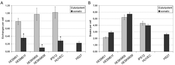 The G2-chromosomal radiosensitivity assay was used to assess the chromosomal aberration frequency in cells exposed to 1 Gy of γ-irradiation and harvested 2 hours later. Two human embryonic stem cell lines (hESM01, hESKM05) had its isogenic somatic cell line: hESM01f and hESKM05f represented the fibroblast cell lines derived from their respective hESCs. Primary human foreskin fibroblasts HS27 were included in the study to compare with fibroblast cell lines derived from hESCs. For enrichment of somatic cell spectrum and additional control of possible effects of in vitro differentiation we also introduced another pair of isogenic pluripotent and somatic cells: induced pluripotent stem cells iPS12 and their parental HUVEC line.