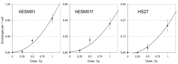 DSB repair at the G2 stage can potentially utilize both NHEJ and HR repair pathways. The formation of chromatid exchanges between non-homologous chromosomes can be due to either from misrejoining of two DSBs in two non-homologous chromosomes by NHEJ or from processing of one DSB by NAHR. These distinct one-hit and two-hit mechanisms of chromosomal aberration formation are characterized by different types of dose-response curves. A linear curve would be expected for the one-hit mechanism because DSBs are linearly dependent from dose. However, if exchanges are formed by interaction of two DSBs, the probability of exchanges should be proportional to the square of the number of DSBs, and a quadratic curve would be expected for such two-hit events [21]. To determine the mechanisms of chromatid exchange formation in our system, we analyzed the dose-response relationship of chromatid exchanges induced by irradiation at G2 at 0.25, 0.75, and 1 Gy for hESM01, hESM01f and HS27 cell lines. The results of cytogenetic analysis are presented in Figure 3 and Supplemental Table 4.