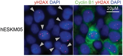The dose response curve for chromosomal exchange aberrations (translocations or dicentrics) induced by γ-radiation exposure of cells at the G0/G1 phase usually includes both linear and quadratic terms: Y=b0+b1*D+b2*D2. The linear term is thought to represent an interaction of two DSBs produced along a single track, and the quadratic term represents interactions between DSBs produced independently by different tracks [21]. In our case, we observed a clear quadratic dose response of exchange yield. A similar observation of a purely quadratic dose-response relationship for chromatid exchanges in human fibroblasts has been previously described by Gotoh et al. [22]. This quadratic dose response indicates that chromatid exchanges were produced by independent radiation-induced DSBs resulting from different tracks and that no interactions between radiation-induced DSBs and endogenous DSBs occurred in pluripotent cells. It should be noted that in hESC lines we observed a high spontaneous level of γ-H2AX foci, which are well-known surrogate markers of DSBs [23]. High spontaneous levels of γ-H2AX foci have been demonstrated previously in mouse ESCs [24, 25]. Double immunofluorescence staining of hESCs with γ-H2AX and G2-specific cyclin B1 antibodies revealed cell cycle phase-related heterogeneity of γ-H2AX foci frequency, with the highest numbers of bright and clear γ-H2AX foci observed at the G2 phase (Figure 4). More specifically, the mean number of γ-H2AX foci was approximately 3 per cyclin B1-positive nucleus but less than 0.1 per cyclin B1-negative cell. However, as mentioned above, our dose-response analysis indicated that hESCs did not have endogeneous DSBs capable of interacting with radiation-induced DSBs to form chromatid exchanges during late G2. This finding indicates that there are no endogenous DSBs in hESCs during late G2 after the G2/M checkpoint transition and provides additional support to the hypothesis that most spontaneous γ-H2AX foci in ES cells are not associated with DSBs [25].