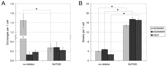 The NU7026 treatment followed by 1 Gy of γ- irradiation resulted in a significant increase in radiation-induced chromatid breaks in all cell lines studied (Figure 5B). The level of chromatid breaks was elevated approximately fourfold to an average of 15-18 breaks per cell. However, radiation-induced chromatid exchanges were affected by NU7026 only in pluripotent hESKM05 cells (Figure 5A). The exchange rate in hESKM05 cells decreased by 80% (from 1.45 ± 0.10 per cell to 0.27 ± 0.09 per cell, p < 0.0001) upon DNA-PK inhibition. It should be noted that NU7026 did not cause chromosomal aberrations or additional γ-H2AX foci without irradiation (Supplemental Table S5). Immunostaining with a phospho-H3 antibody demonstrated that NU7026 treatment did not alter the number of cells that reached metaphase after irradiation, i.e. NU7026 didn't influence G2/M checkpoint (data not shown). Thus, our data indicate that DNA-PK suppresses the formation of chromatid breaks during late G2 in both types of cells studied.