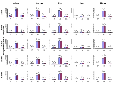 Almost all DNA damage in all the tissues analyzed was effectively repaired 24 hours after exposure, evident by the decrease of the γ-H2AX foci to near control levels (Fig. 1). Yet, some significant residual persistence of the IR-induced foci was seen in spleen, thymus, liver, lung and kidney of 7 and 14 days old animals.