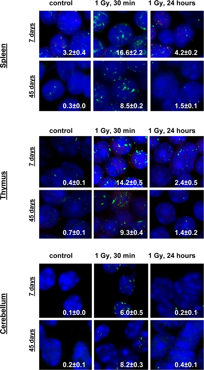 Exposure to 1 Gy of X-rays caused significant DNA damage which was evidenced by a profound increase of the γ-H2AX foci levels in all the somatic tissues of mice (Fig. 1). The increase in the number of IR-induced γ-H2AX foci was the highest in lymphoid organs (thymus and spleen) of 7 and 14 day old mice 30 minutes after exposure (in thymus - up to 14.2±0.5 foci per nucleus in 7 days old males, 13.8±0.6 - in 7 days old females, 14.5±0.5 - in 14 days old males and up to 14.2±0.6 foci per cell in 14 days old females; in spleen - up to 16.6±2.2 - in 7 days old males, 16.0±2.0 foci per cell in 7 days old females, 14.2±0.3 - in 14 days old males and up to 14.0±0.3 foci per cell in 14 days old females) (immunostaining is shown in Fig. 2). The lowest focal induction levels were seen in lung tissues of 7 days old animals (up to 1.9±0.4 - in 7 days old males and up to 0.9±0.3 foci per cell in 7 days old females) (Fig. 1A). In older animals (30 and 45 day old mice) the induction of γ-H2AX focus levels was lower than in young animals (Fig. 2).
