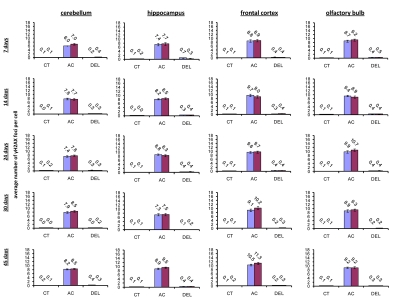 IR exposure also caused DNA damage in brain of exposed mice. We observed a very significant accumulation of 1 Gy of IR-induced γ-H2AX foci in all the studied regions (from 0.1-0.2 foci per nucleus in the un-irradiated brain tissues up to 6-10 foci per nucleus 30 minutes after exposure) (Fig. 4 and example of immunostaining in cerebellum is shown in Fig. 2). The majority of DSBs in brain were effectively repaired, and only slight residual persistence of γ-H2AX foci was noted 24 hours after exposure (in the range of 0.3-0.7 foci per nucleus on average) (Fig. 4 and cerebellum in Fig. 2). This persistence was the highest in the 7 days old male mice, especially, in their hippocampi (0.7±0.2 foci per nucleus). Hippocampus, a site of active neurogenesis in young animals is crucially important in memory and cognition. Therefore, elevated γ-H2AX foci persistence in hippocampus may be partially related to active neurogenesis. However, on the whole, focal persistence in brain was similar to the somatic tissues and only partially related to the increased proliferative capacity, since cellular PCNA levels were slightly increased only in the brain regions of 7 day old animals (Fig. 5).