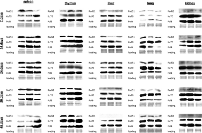 In spleen of 7 day old animals we observed induction of Ku70 and Polβ only 24 hours after exposure. This was consistent with the highest amount of persistent DNA strand breaks in the spleen of 7 days old mice. In 14, 24, and 30 day old animals Ku70 and Polβ induction was noted 30 minutes after exposure. Interestingly, in spleen we did not see any induction of Rad51 levels by IR. Furthermore, the cellular Rad51 levels in spleen decreased with age. In thymus of 7 day old mice, we found a significant induction of Rad51 30 minutes after exposure. In the other age groups only slight Rad51 induction occurred 24 hours after irradiation (Fig. 6). Ku70 was induced 30 minutes post-IR in thymus of young animals, and 24 hours post-IR of more mature ones. In liver and kidney, we saw slight increases in Ku70 and Polβ in the exposed animals of all age groups, except the very young ones. The levels of Rad51 were also very low, and further diminished with age.