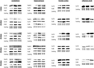 Western immunoblotting for RAD51, KU70 and POLB was conducted using spleen, thymus, liver, lung, kidney, hippocampus, frontal cortex, cerebellum, olfactory bulb tissue as previously described [75]. Tissue samples were sonicated in 0.4-0.8 ml of ice-chilled 1% sodium dodecyl sulphate (SDS) and boiled for 10 min. Small aliquots (10 μl) of homogenate were reserved for protein determination using protein assay reagents from BioRad (Hercules, CA). Equal amounts of proteins (25 μg) were separated by SDS-polyacrylamide electrophoresis (PAGE) in slab gels of 8 or 12% polyacrylamide, made in triplicates, and transferred to PVDF membranes (Amersham, Baie d'Urfé, Québec). Membranes were incubated with antibodies against RAD51, KU70 (1:1000, BD Biosciences), POLB (1:1000, Biomeda, Foster City, CA). Antibody binding was revealed by incubation with horseradish peroxidase-conjugated secondary antibodies (GE Biosciences) and the ECL Plus immunoblotting detection system (GE Biosciences). Chemiluminescence was detected by Biomax MR films (Eastman Kodak, New Haven, CT). Unaltered PVDF membranes were stained with Coomassie Blue (BioRad, Hercules, CA) and the intensity of the Mr 50,000 protein band was assessed as a loading control. Signals were quantified using NIH ImageJ 1.63 Software and normalized to both actin and the Mr 50,000 protein which gave consistent results.