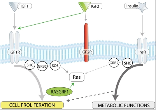 We have recently identified a crucial genomic imprinting-related epigenetic mechanism that governs the VSEL quiescent state, preventing their proliferation and the spontaneous growth of teratomas [13]. This mechanism is based on the epigenetic changes in selected somatic-imprinted genes (i.e., Igf-2-H19, RasGRF1, and IGF-2R) that are involved in insulin (Ins) and insulin-like growth factor signaling (IGF-1 and IGF-2). By erasing paternal imprints, VSELs downregulate expression of IGF-2, which seems to be an autocrine growth factor for these cells. Additionally, Ins/Igf signaling in VSELs is impaired due to erasure of the paternal imprinting of the RasGrf1 gene, which represses its expression. In support of this notion, we observed that in embryonic stem cells, RasGrf1 is indeed the downstream signaling protein for activated insulin and insulin growth factor-1 receptors (Figure 1). Furthermore, in addition to perturbed imprinting of paternally imprinted genes in VSELs, some of the maternally imprinted genes become, by contrast, hypermethylated. One of these genes is the IGF-2 receptor (IGF-2R), which serves as a molecular sink for IGF-2 and prevents its interaction with IGF-1 receptor (IGF-1R) [12]. The involvement of these paternally imprinted (Igf-2 and RasGrf1) and maternally imprinted (IGF-2R) genes in insulin and insulin-like growth factor signaling is depicted schematically in Figure 2.