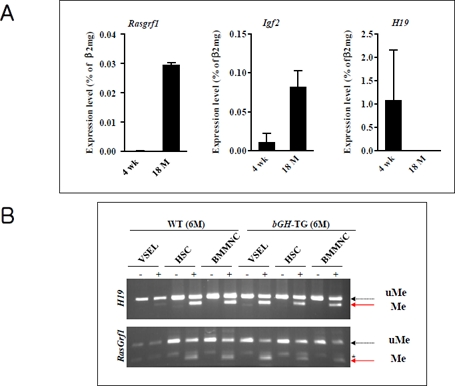 Further evidence for the role of VSELs and imprinted genes on lifespan comes from our recent studies on murine models of longevity [15]. We observed that the number of VSELs in BM positively correlates with extended lifespan and both parameters are negatively affected by plasma IGF-1 level. In support of this observation, while long-living Laron dwarf mice with low circulating plasma IGF-1 levels have a significantly higher number of VSELs at age 2 years compared to their wild type (wt) littermates [14], short-living bovine GH-overexpressing transgenic mice with high levels of circulating IGF-1 display a reduced number of VSELs at age 6 months [15]. These changes in the number of VSELs were correlated with hypomethylation of DMRs at the Igf-2-H19 and RasGrf1 loci in Laron dwarfs and hypermethylation of these loci in GH-transgenic animals ([14, 15] and Figure 3 panel B). The corresponding reduction in VSEL number and increased hypermethylation of DMRs for Igf-2-H19 and RasGrf1 loci and expression of these genes was recently confirmed in wt mice that were injected for 2 months with GH or IGF-1 (submitted for publication).