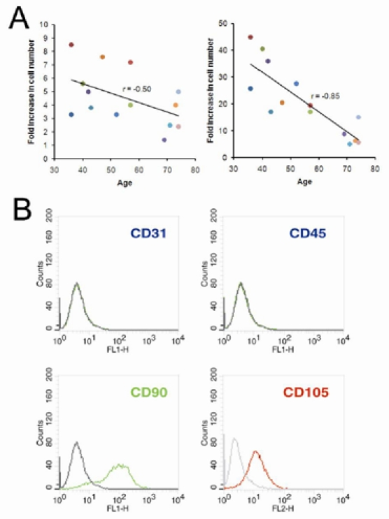 While expanding stem cell populations from each bone marrow sample, we counted the plastic-adherent cells after three and six days post-seeding at passage one, calculated the fold increase in cell number for each line of bone marrow-derived cells, and correlated the data with the age of their donors. As shown in the left panel of Figure 1A, after three days post-seeding, the fold increase in cell numbers was negatively correlated with the age of donors, although this was not significant (r=−0.50, p=0.069). Nevertheless, a rather significant correlation (r=−0.85, p=0.001) was found after six days post-seeding (right panel, Figure 1A). Subsequently, these cells were characterized as bmMSC by flow cytometric analyses (Figure 1B).