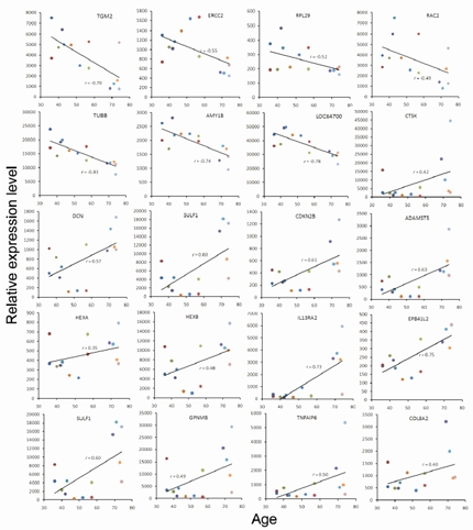 The microarray analysis was performed using Illumina gene expression chips. Considering that the numbers of female donor as well as OA-free donor were low in this study, we thought that it would be more proper for us to focus on the age-related genes. However, because OA is an aging-associated disease, we also examined the gene expression profile associated with OA. First, we performed neighborhood analysis applying t-statistics (see Methods) to know if there exist genes that are associated with age or the presence of OA. The results showed that the expression level of many genes did have strong correlation with either age or the presence of OA (supplemental information, Figure S1-A and -B). Subsequently, we analyzed the microarray data with a multivariate linear regression model considering age, gender, and disease status (with or without OA) as covariates. Through such analysis, out of 48804 probes, the expression of 574 probes that contain 497 genes was found significantly correlated with age (p<0.05), as represented by 20 selected genes including HEXA, HEXB, CTSK, SULF1, ADAMTS5, SPP1, COL8A2, GPNMB, RPL29, TNFAIP6, CDKN2B, etc. (Figure 2, see Discussion). These genes were named age-associated genes (supplemental Table SI). On the other hand, there were 112 probes containing 92 genes correlated with OA, which were named OA-associated genes (supplemental Table SII). There was a moderate overlap of only 38 probes (29 genes) between age- and OA-associated genes (supplemental Table SIII).