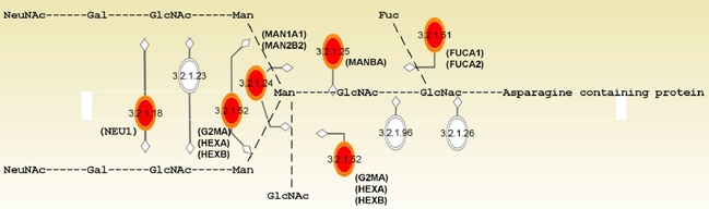 To know what cellular functions or molecular pathways in which the age- and OA-associated genes were involved, we categorized these genes using the Ingenuity Pathway Analysis (IPA). Table III summarized the enriched top functions and canonical pathways. As shown, among the top ranked Gene Ontology function terms enriched by age-associated genes were cell growth and proliferation (p = 2.7×10−5~1.9×10−2), cellular movement (p = 2.94×10−5~2.07×10−2), cell cycle (p = 6.2×10−5~2.2×10−2), and cell morphology (p = 8.2×10−5~1.7×10−2). These results suggested that these cellular functions are most likely to change with age in human bmMSC. In spite of these results, there was no significant enrichment of specific cellular location (data not shown), indicating that the aging-related cellular activities might take place in various cellular compartments, rather than specific locations. Most intriguingly, our results showed that pathways for degradation of N-glycans (p = 8.9×10−8, Figure 3), degradation of glycosaminoglycans (GAGs, p = 5.7×10−4), and biosynthesis of glycosphingolipids (p = 5.7×10−3) were the top canonical pathways enriched by age-associated genes. The ratio of enrichment of genes in a specific pathway was 9/31, 6/71, and 4/45, respectively.