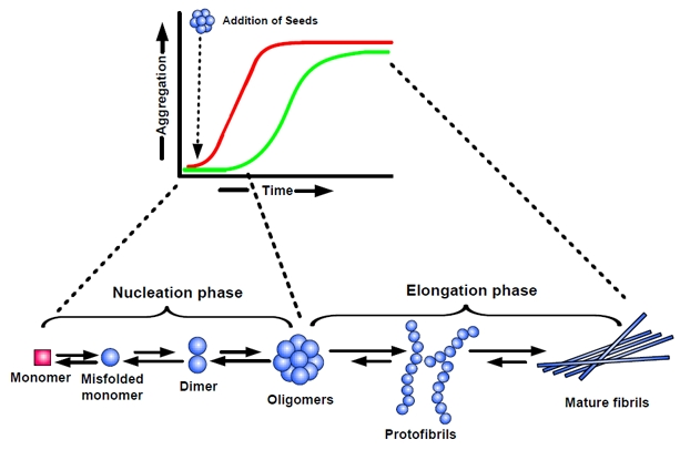 A widely accepted concept for the formation of amyloid fibrils is the nucleation-dependent polymerization model [41-43], which separates the fibrillization process into a nucleation phase and an elongation phase. Nucleation requires the self-association of soluble monomers, which is thermodynamically unfavourable and so occurs slowly. In the nucleation phase, monomers undergo conformational changes and self-associate to form oligomeric nuclei that are rich in β-sheets. Once the nucleus is formed, assembly of larger aggregates and fibril elongation, a much more favourable process and proceeds rapidly. As a result, the kinetics of amyloid fibril formation is well represented by a sigmoidal shape with a nucleation phase/lag phase followed by a rapid growth phase, followed by a saturation phase (Figure 2; green curve). The lag phase is determined by the critical concentration of nuclei, which represent seeds for further growth of the polymers finally resulting in mature fibrils. Accordingly, the lag phase of aggregation can be shortened by addition of preformed seeds (Figure 2; red curve).