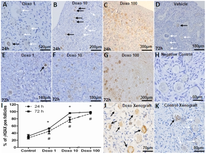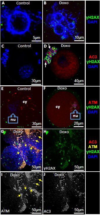 The goal of this study was to explore the mechanism of the acceleration of human ovarian aging as a result of chemotherapy. To investigate this effect we utilized a commonly administered cancer chemotherapeutic, doxorubicin, in an in vivo xenograft as well as in vitro models, using a double-species approach. DNA damage response induced by doxorubicin was assessed immunocytochemically by detecting histone H2AX phosphorylation on Ser139 [3] and activation of Ataxia Telangiectasia Mutated protein kinase (ATM) through its phosphorylation on Ser1981, using the respective phospho-specific Abs [4]. The extensive nuclear labeling with these Abs, especially in form of characteristic foci, is considered to report the presence of DSBs, the potentially lethal DNA lesions.