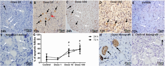 For in vitro experiments, human ovarian cortical pieces were cultured for 24-72h with or without doxorubicin at 1, 10, 100 μg/ml doses and primordial follicle densities were compared. The presence of γH2AX, the reporter of DSBs [3, 4] and primordial follicle apoptosis, detected by the activated caspase-3, were studied in adjacent OCT sections. A significantly higher percentage of γH2AX-positive primordial follicles were observed in OCTs incubated with 1 μg/ml doxorubicin for 24h in comparison to vehicle-treated controls (45.2±7.3 vs. 26.5±2.9 %, p=0.005) and 72h (53.2±1.7 vs. 31.7±4.5 %, p<0.001) (Figure 1, A-H). Treatment with 10 μg/ml doxorubicin resulted in a significantly higher percentage of γH2AX-positive primordial follicles both after 24h (77.5±7.4 %, p<0.001) and 72h (96.2±7.2 %, p<0.001) compared to control. Doxorubicin 100 μg/ml induced massive γH2AX labeling in ovarian follicles regardless of the incubation time (94.8± 2.4 and 99.1±1.7 %, 24h and 72h respectively, p<0.001). A significant correlation was observed between the dose of doxorubicin and the percentage of γH2AX-foci positive primordial follicles in cultured OCTs (Spearman's rank correlation coefficient: 0.967; p<0.001) (Figure 1, I).