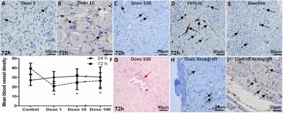 The density of newly forming ovarian microvessels was determined by CD31-expression in micro vessels per mm2 after treatment with doxorubicin. The results showed a decrease in vascular density with the 72h culture after 1 μg/ml (26.5±8.4/mm2, p<0.001), 10 μg/ml (25.5±7.8/mm2, p<0.05), and 100 μg/ml doxorubicin (20.8±5.1/mm2, p<0.05) compared to vehicle treatment (39.4 ±5.7/mm2)(Figure 4, A-D). In contrast, blood vessel density increased significantly after 72h culture in vehicle-treated controls compared to the uncultured baseline tissue (39.4±5.7/mm2 vs. 30.0±6.2/mm2, p<0.001), (Figure 4, D and E), due to expected continuation of microvessel proliferation. There was also a significant decrease in the density of mature blood vessels as determined by αSMA IHC after 72h culture with 10 μg/ml (4.0±2.0 vs. 9.5±3.5, p=0.002) and 100 μg/ml doxorubicin (4.7±3.1 vs. 9.5±3.5, p=0.04) compared to controls. A significant inverse-correlation was observed between the dose of doxorubicin and the density of αSMA-positive vessels (Spearman's rank correlation coefficient: −0.798; p<0.001)(Figure 4, F). Furthermore, after 72h culture with doxorubicin 1, 10 and 100 μg/ml, multiple necrotic areas were seen in OCTs (7.3±5.1, mean number of necrotic areas/graft)(Figure 4, G). Validating and confirming in vitro organ culture experiments, doxorubicin treatment also resulted in reduced vascular density in xenografted human ovarian tissues compared to vehicle-treated controls (6.4±1.9 vs. 13.9±2.1, p<0.001)(Figure 4, H and I).