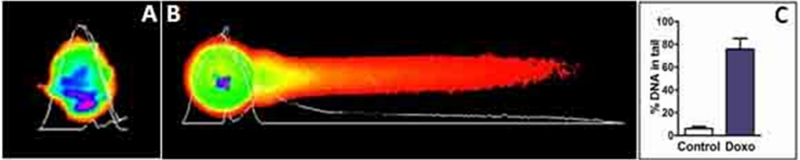 The comet assay is based on the ability of negatively charged fragments of DNA to move through an agarose gel in response to an electric field. The extent of DNA migration depends directly on the DNA damage present in the cells. The alkaline version of the comet assay enables the detection of DNA single-strand breaks and alkali-labile lesions (DNA breaks that only become apparent after exposure to alkali) while electrophoresis at neutral conditions detects DSBs[6]. To confirm that increased γH2AX foci reflected DSBs, we performed a neutral pH comet assay on GV oocytes treated in vitro with doxorubicin 10 μg/ml. for 24h and found similar results (Fig 6).