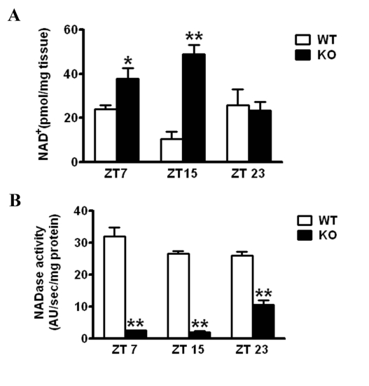 Our current work has addressed the question whether alterations in NAD+ rhythmicity in vivo could affect the functioning of central and peripheral clocks. For this purpose we explored the circadian behavior of CD38-KO mice which have elevated NAD+ levels. We observed that oscillations in NAD+ levels were altered in the liver of CD38-KO mice. Strikingly, at ZT 15 (the trough of NAD+ levels in WT liver), NAD+ levels peaked in CD38-KO mice and were ~ 5 times higher than those in the liver of WT mice. Surprisingly, NAD+ levels were similar between WT and CD38-KO mice at ZT23. This could be due to an increase at this circadian time of NADase activity in CD38-null mice. Although CD38 is the major NAD+ hydrolase in cells, it is possible that in its absence other NAD+ hydrolases (such as CD157, a gene duplication product of CD38) could be induced as a compensatory mechanism.