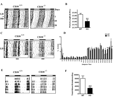 Since the clock machinery controls the cyclic levels of NAD+, we wondered about the importance of this oscillation with respect to circadian function. We thereby questioned whether an imbalance of NAD+ levels in animals with an intact clock system would lead to defects in circadian rhythms. To test this hypothesis, we analyzed the circadian behavior and metabolism of CD38-deficient (KO) mice which display very high levels of NAD+ in tissues such as the brain and liver [17,18]. CD38 is a membrane protein that has multiple enzymatic activities [19], the major being the hydrolysis of NAD+, through which it controls cellular NAD+ levels [20,21]. CD38 is also present on the inner nuclear membrane and regulates SIRT1 activity through modulation of NAD+ levels [17,22]. SIRT1 activity is higher in the CD38-KO mice [22]. Interestingly, CD38-KO mice are resistant to high-fat diet-induced obesity, in part through the activation of the SIRT1-PGC1α axis [23]. Our present study shows that chronically elevated levels of NAD+ in CD38-null mice lead to modulation of the circadian clock illustrated by altered circadian behavior, clock gene expression and amino acid metabolism.