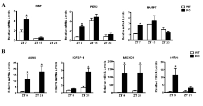 Ablation of CD38 results in disturbances in the peripheral clockwork. The behavioral analysis of the CD38-KO mice indicates that deregulated and elevated levels of NAD+ alter central clock functions. To address whether peripheral clock function is also affected by deregulated NAD+ levels, we analyzed the circadian gene expression of representative clock genes from liver. WT and CD38-KO mice were entrained to a 12 hr LD cycle and livers were harvested at various circadian times. As shown in Fig. 3A, the amplitude of circadian gene expression of Dbp,Per2 and Nampt is significantly higher in CD38-null than in WT mice, with most divergent levels at ZT7. These results indicate that peripheral clock is also affected by elevated NAD+ levels.