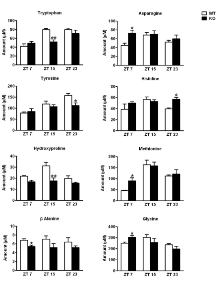 Alterations in the plasma amino acid levels in the CD38-KO mice. We performed a metabolomic study to determine the plasma amino acid levels in WT and CD38-KO mice along the circadian cycle, according to the method described by Lanza et. al. [30]. Most amino acid levels oscillated in a pattern consistent with that recently described by Minami et. al. [10]. We observed significant changes in the amino acid levels between the WT and the CD38-KO mice, at different circadian times. Four amino acids (Tryptophan, Hydroxyproline, Tyrosine, and β-Alanine) displayed significantly reduced levels at one or more circadian time in the plasma of CD38-KO mice (Fig. 4). On the other hand, four amino acids (Asparagine, Glycine, Histidine and Methionine) displayed higher levels in the CD38-KO mice (Fig. 4). These results demonstrate that the circadian oscillations in amino acids levels are compromised in the CD38 KO mice, thereby establishing a direct link between specific amino acid metabolic pathways and controlled NAD+ levels.