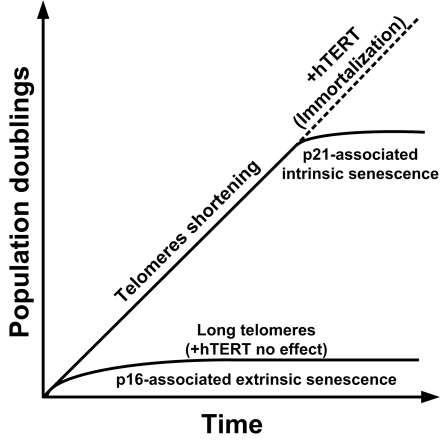 Cellular senescence can be caused by intrinsic or extrinsic factors and this distinction is important [6]. Intrinsic senescence is caused by telomere shortening, which occurs after each cell division. Cells that do not express telomerase thus have a limited number of possible cell divisions before genomic instability ensues. This triggers the p53, p21 and pRb pathways to promote growth arrest and cellular senescence. Because murine cells have very long telomeres, they are not believed to undergo intrinsic senescence in normal conditions. Indeed, mice lacking telomerase activity only show signs of accelerated aging after six generations [6]. However, murine cells are also renowned for their high rate of transformation when cultured in vitro. This usually occurs after very few population doublings when the cells enter a crisis phase and stop proliferating. Although most of those cells do not survive, some transformed and immortalized clones often arise from the culture and display a high degree of genomic instability and a propensity for tumorigenesis. This type senescence that precedes transformation is thought to be caused by artificial laboratory culture conditions (such as high oxygen) and is referred to as extrinsic senescence. It mainly involves the p16INK4a pathway in human cells and also the p19/ARF pathway in murine cells. In human cells, both intrinsic and extrinsic senescence can thus coalesce to play a role in aging.