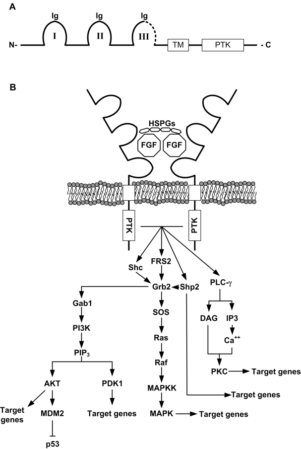 FGFs (23 known members) and FGFRs (5 known members, expressed as multiple splice variants) have long been known for their important roles in embryonic development [8, 9]. However, the vast number of somewhat redundant ligands and receptor variants, as well as the promiscuous ligand usage by the receptors has made it difficult to study the roles of FGFs/FGFRs using genetic methods [10]. Furthermore, FGF signaling is modulated by tissue specific heparan-sulfate proteoglycans (HSPGs) that either inhibit or amplify FGFR activation. The divergent effects of FGF signaling also appear to depend on the state of differentiation of the cells, the repertoire of FGFRs they express, and the presence of other growth factors or cytokines. Nevertheless, as further tools and reagents are developed, a more comprehensive image is starting to emerge.