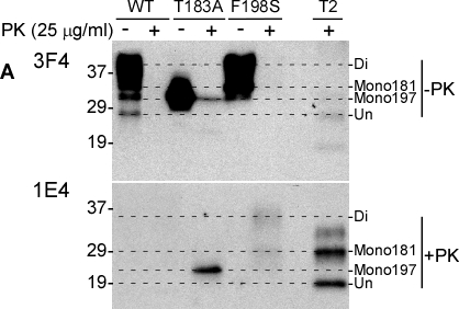 To determine which fractions contain PK-resistant wild-type or mutant PrP, we treated PrP from fractions 1 to 11 with PK and PNGase F (Fig. 2B). PK-resistant PrPT183A was only detected in fractions 10 and 11 when probed with 3F4; other fractions did not show any PK-resistance. In addition, 3F4 did not detect PK resistant wild type and F198S mutant PrP in any sucrose gradient fraction, while 1E4 detected PK-resistant iPrP in all three PrP species, with the highest intensity in the T183A mutant PrP (Fig. 2B). However, small amounts of PK-resistant PrP were only observed in fraction 10 for PrPWt and PrPF198S, whereas a larger amount of PK-resistant PrP was detected in fractions 10 and 11 for PrPT183A.