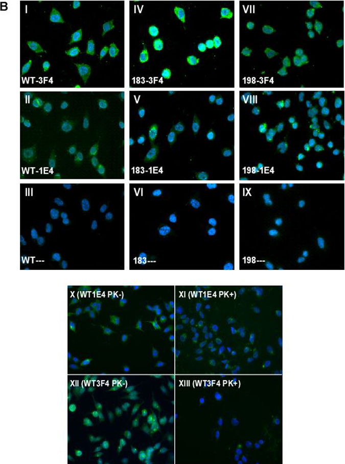 Utilizing immunofluorescence tagging and microscopy, we next compared cells expressing PrPWt, PrPT183A and PrPF198S by immunostaining with 1E4 or 3F4. Consistent with Western blotting, all three cell types exhibited greater immunostaining with 3F4 than with 1E4 (Fig. 1B). Notably, although weak, PrPWt and two PrP mutants became detectable by immunofluorescence with 1E4, in contrast to results by Western blotting with 1E4 shown in Fig. 1A. In addition, as demonstrated previously, PrPT183A is most likely located intracellularly, while wild type and PrPF198S are present on the cell surface [10]. 3F4 immunostaining was reduced to almost insignificant levels when wild type cells were treated with PK (Fig. 1B), consistent with Western blotting results. In contrast, 1E4 immunostaining was decreased after PK-treatment, which was opposite to that observed in Western blots.