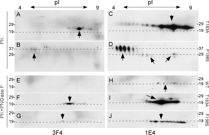 After treatment with PK and PNGase F, the two mutants exhibited PK-resistant forms, but not the wild type (Fig.3E-G). The PK-resistant PrPT183A and PrPF198S forms detected with 3F4 exhibited similar gel mobility at 19-20 kDa with pH between 7.0 and 9.5 on the blots, although there was a slight difference in pH between the most intense spots (Fig. 3F and 3G). However, in samples probed with the 1E4 antibody, the PK-resistant iPrPC became detectable even for PrPWt. The faint wild type spots migrating at ~19-20 kDa with pH 7.5-8.5 (Fig. 3H) while more intense PK-resistant PrPT183A and PrPF198S spots were detected with similar gel mobility migrating at ~19-20 kDa and pH 7-9.5 (Fig. 3I and 3J). Furthermore, these 2-D analyses of glycosylated and deglycosylated PK-resistant mutant iPrP indicated that glycans at the second site are more basic, whereas glycans at the first site are more acidic. 2-D blots, similar to the 1-D immunoblotting, also demonstrated that 1E4 has higher affinity for PK-resistant iPrP compared to 3F4. As indicated above, the effect of the two mutations by themselves on the charge of the proteins was not predicted. Two possibilities that may explain the slight differences in the pH of intense spots after deglycosylation: the three types of proteins have either distinct N-terminal protease cleavage sites or distinct GPI anchors.