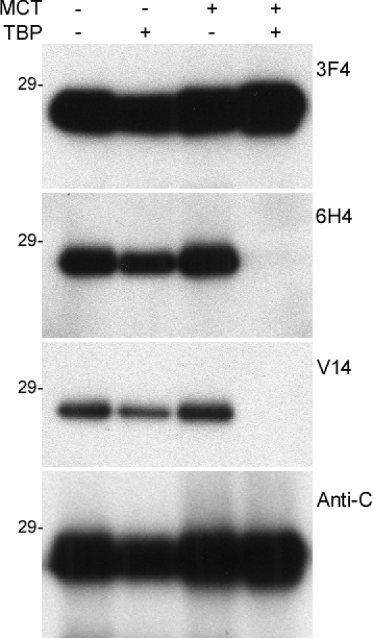 In addition to the V14 antibody, three other antibodies were used as controls: 3F4 directed against PrP105-112, 6H4 directed against PrP145-152 and anti-C against PrP220-231. All antibodies detected untreated recombinant human PrP23-231, while they also detected PrP in samples treated with TBP or MCT alone (Fig. 5). Treatment with TBP alone decreased the intensity of PrP probed with the four antibodies. However, V14 detected no PrP at all in samples treated with TBP and MCT together, while 3F4 and anti-C antibodies still detected PrP (Fig. 5). This result is similar to our previous observation with 6H4 [13, 20].
