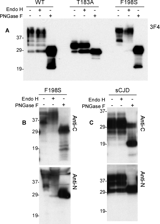 We treated PrPWt, PrPT183A and PrPF198S with Endo H, or PNGase F that cleaves N-linked glycans. The Endo H treatment did not significantly change the gel profile and glycoform ratios of PrPWt (Fig. 6A). In contrast, it did significantly reduce the intensity of the monoglycosylated PrPT183A and increase the intensity of its unglycosylated form (Fig. 6A). No relevant changes in the intensity of di-glycosylated PrPF198S were observed, while the two monoglycosylated PrPF198S species became undetectable after treatment with Endo H, suggesting that Endo H only removes glycans from monoglycosylated PrP at the two sites. On the other hand, a faint band migrating at ~28-29 kDa corresponding to the unglycosylated and deglycosylated PrPF198S was visible in the treated sample, probably deriving from monoglycosylated PrP (Fig. 6A). After treatment with PNGase F, all three different PrP species were observed to have a band migrating at ~28-29 kDa corresponding to deglycosylated and unglycosylated PrP (Fig. 6A). However, only PrPWt and PrPF198S exhibited a band migrating at ~20 kDa corresponding to endogenously N-terminally truncated fragment C2.
