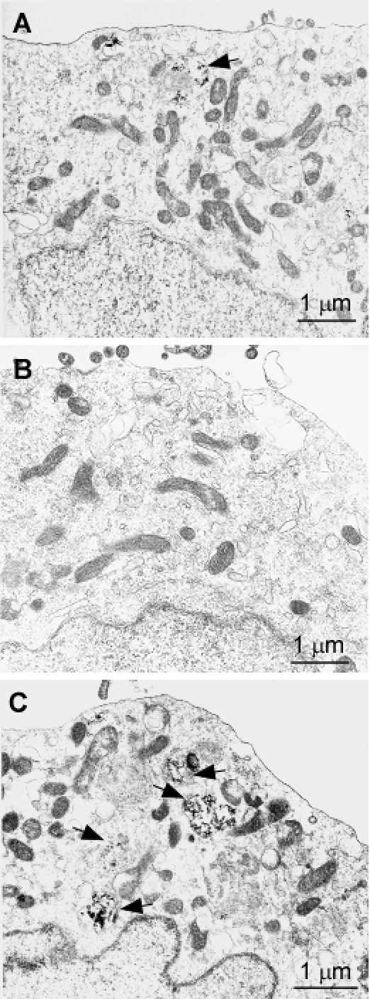 Since the two mutations significantly increased PrP aggregation, as evidenced above by protein chemistry studies, we asked whether there are any changes in organelles and cellular structures induced by mutant PrP that readily formed aggregates. Cells expressing PrPWt, PrPT183A, or PrPF198S were examined by electron microscopy (Fig. 7). Although most organelles including mitochondria and nucleus seemed to be identical between these cells, the lysosome had characteristic differences between cells expressing the various PrP species. Compared to PrPWt cells (Fig. 7A), PrPF198S cells exhibited enhanced autophagy (Fig. 7C), while virtually no autophagy was observed in PrPT183A cells (Fig. 7B).