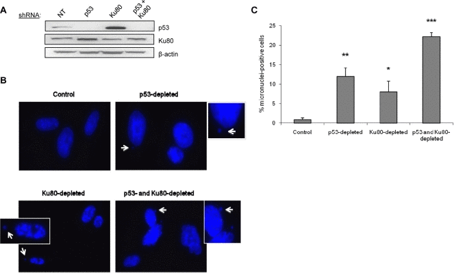 Due to its involvement in multiple genomic functions, we postulated that the Ku heterodimer functions in both DNA repair and in facilitating cell cycle arrest to ensure faithful repair has been completed. To begin to address this possibility, we used a targeted knockdown approach to reduce the levels of Ku80 and p53 in WI38 fibroblasts using shRNA vectors that we have found to be effective for reducing Ku80 and p53 levels in these cells (Figure 1A, Supplemental Figure 1) [8]. As a measure of genomic integrity and proper DNA repair, we examined the formation of micronuclei, which are known to form when cells enter mitosis with unresolved chromosomal damage. We predicted that decreasing Ku levels would increase micronuclei formation in human cells. As predicted, more than 8-fold more cells with micronuclei were found in Ku80-depleted fibroblasts compared with control fibroblasts (Figure 1B,C). Interestingly, we found that targeting Ku80 resulted in an increased number of cells with micronuclei even in the absence of exogenous DNA damage (Figure 1B,C). As a positive control, we targeted p53 using shRNA, and the p53 knockdown cells also contained a higher percentage of micronuclei-positive cells confirming that genomic instability can arise upon inactivation of p53 pathways (Figure 1A-C) [9]. As would be predicted, fibroblasts deficient in both p53 and Ku80 contained the most micronuclei-positive cells: 22% positive compared to 12% positive and 8% positive in p53-depleted and Ku80-depleted, respectively (Figure 1B,C).