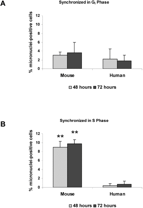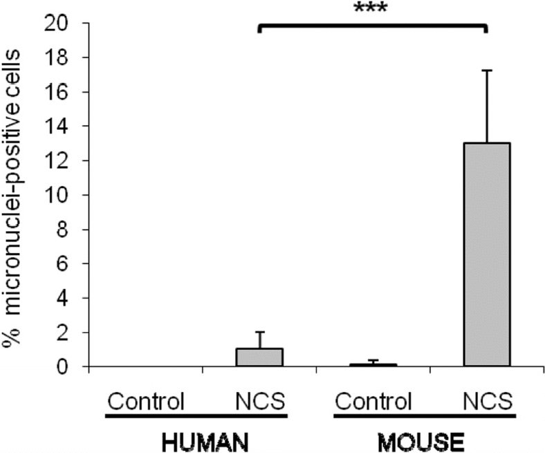 Because we had previously noted that rodent cells express significantly lower levels of Ku80 than human cells [7], we examined micronuclei formation in mouse cells and compared this with human cells. We found that mouse cultures have a higher percentage of micronuclei-positive cells than human cultures following treatment with the DNA-damaging agent neocarzinostatin (Figure 2).