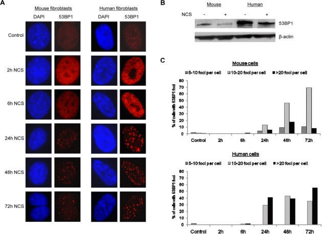 During the evaluation of micronuclei, we examined 53BP1 accumulation by immunofluorescence and noted a significant difference between mouse and human cells. After induction of DNA damage with neocarzinostatin, human fibroblasts contained more visible 53BP1 foci than mouse fibroblasts (compare human cells in right panel to mouse cells in left panel in Figure 3A). This difference in micronuclei after damage was confirmed by Western blot analysis using an antibody that was raised against an epitope of 53BP1 that is conserved between mice and humans (Figure 3B). The number of 53BP1 foci per cell was quantified, and although both mouse and human fibroblasts displayed an increase in 53BP1 focus formation after DNA damage induction, a higher percentage of human fibroblasts contained greater than twenty 53BP1 foci per cell by 72 hours following induction of DNA damage (Figure 3C). These findings suggest that human fibroblasts display a more robust activation or upregulation of 53BP1 in response to DNA damage.