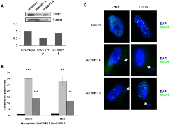In order to determine whether human cells would display an increase in micronuclei formation similar to mouse cells if the levels of 53BP1 were reduced, WI38 human fibroblasts were infected with one of two shRNA constructs targeting 53BP1 (sh53BP1 A or B), and these constructs led to either a 46% or a 13% reduction in 53BP1 protein levels (Figure 4A). 53BP1-depleted WI38 human fibroblasts were treated with neocarzinostatin to induce DNA damage, and micronuclei were counted as a marker of unresolved DNA damage. The amount of 53BP1 present in human fibroblasts appeared to be associated with the percentage of micronuclei-positive cells (Figure 4B,C). Fibroblasts treated with a scrambled control shRNA construct contained very few micronuclei (1.36% of cells with micronuclei), while fibroblasts with reduced 53BP1 levels had significantly more micronuclei. Interestingly, the level of 53BP1 knockdown correlated with micronuclei, since fibroblasts treated with the shRNA construct producing the 46% knockdown (sh53BP1 A) contained 30.19% micronuclei-positive cells, while fibroblasts exhibiting the 13% knockdown in 53BP1 (sh53BP1 B) contained 13.73% micronuclei-positive cells (Figure 4B,C). Strikingly, the increase in micronuclei-positive cells upon 53BP1 reduction appeared to be independent of DNA damage, since similar numbers of micronuclei were observed in non-damaged cells and the number of micronuclei did not increase further upon DNA damage induction (Figure 4B,C).