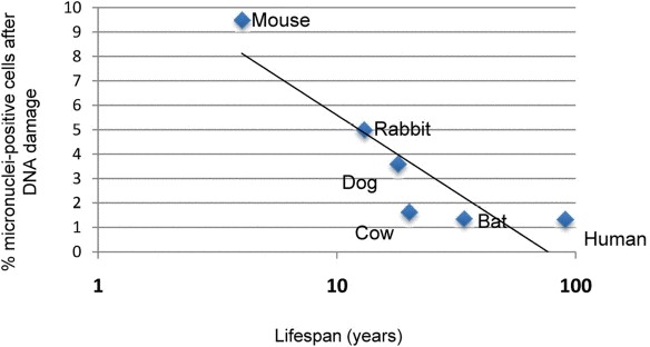 In order to determine whether the genetic instability observed in rodent cells correlated with species lifespan, we analyzed micronucleus formation after DNA damage in fibroblasts from several mammalian species with differing lifespan, which have been established under strictly standardized culture conditions [13]. These species include, in order of increasing maximal species lifespan, mouse, rabbit, dog, little brown bat, bovine, and human. We found that fibroblast cultures from longer-lived species displayed a lower percentage of micronuclei-positive cells when compared with fibroblasts from shorter-lived species (Figure 6). Mouse fibroblasts contained the most micronuclei after damage (9.18% of cells), while human fibroblasts showed the fewest number of micronuclei-positive cells (1.34% of cells), and the percent of cells containing micronuclei demonstrates a negative correlate with lifespan (Spearman correlation coefficient −0.798, P = 0.0006).