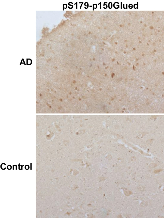 In adult tissues, Plk1 is not present or present at a very low level in non-proliferating tissue cells, such as brain, pancreas and heart [9]. However, Plk1 can be detected in brain tissues of patients with AD [13]. But whether Plk1 is involved in the pathogenesis of AD is still unknown. Considering the fact that Plk1 regulates cell cycle through phosphorylation of its substrates, we examined brain samples of AD patients by immunocytochemistry staining of phospho-Ser179-p150Glued. p150Glued, the largest subunit of the dynein/dynactin motor complex, plays important roles in many cellular processes, including neurodegeneration [15]. Our published work demonstrated that Plk1-mediated phosphorylation of p150Glued at Ser179 starts at interphase and that the phosphorylation event facilitates nuclear envelope breakdown at prophase of the cell cycle [14]. Phosphorylation of S179-p150Glued was detected in brain tissues of AD cases but not age-matched controls, indicating that not only Plk1 protein is expressed but its kinase activity is also activated in AD patient brains (Figure 1).