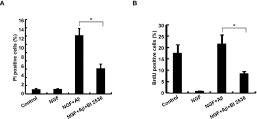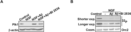 To further investigate the role of Plk1 in AD formation, we established an in vitro cell culture system to mimic aberrant neuronal cell cycle re-entry during the pathogenesis of AD. Rat pheochromocytoma PC12 cells were first fully differentiated to neuronal-like cells by nerve growth factor (NGF) treatment, mimicking the terminally differentiated neurons in adult brains [16]. Then Aβ25-35 was then introduced to induce cell cycle re-entry and eventually neuronal cell death [1]. We first monitored Plk1 protein expression level during the process. As expected, Plk1 protein level was abolished after NGF treatment, indicating that PC12 cells were enriched at G0 phase after NGF treatment. Upon Aβ25-35 treatment-induced cell cycle re-entry, Plk1 protein level was elevated. When PC12 cells were treated with BI 2536, a Plk1 inhibitor, together with Aβ25-35, a slight decrease in Plk1 protein level was observed possibly due to the slowed progression of cell cycle re-entry (Figure 2A). We also performed in vitro IP/kinase assays to test Plk1-associated kinase activity in our system. As shown in Figure 2B, Plk1 kinase activity mirrors Plk1 protein level in our system (Figure 2B). These results indicate that Plk1 is expressed and activated during the cell cycle re-entry of neuronal cells.