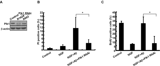 To evaluate the significance of elevated Plk1 level during the cell cycle re-entry process, Plk1 activity was inhibited by BI 2536 treatment. Inhibition of Plk1 significantly decreased Aβ-induced neuronal cell death, indicating that Plk1 promotes Aβ-induced neuronal cell death (Figure 3A). BrdU incorporation assay also showed that DNA synthesis was reduced after BI 2536 treatment, suggesting that Plk1 inhibition prevents Aβ-induced cell cycle re-entry (Figure 3B). Since BI 2536 might also partially inhibit Plk2 and Plk3 activities due to nonspecificity of the drug [17], we performed Plk1 RNAi to test whether Plk1 promotes neuronal cell cycle re-entry and consequent cell death. Knockdown efficiency of Plk1 protein was demonstrated by Western blotting (Figure 4A). Knock-down of Plk1 significantly prevented cell cycle re-entry (Figure 4C) and decreased Aβ-induced neuronal cell death (Figure 4B).
